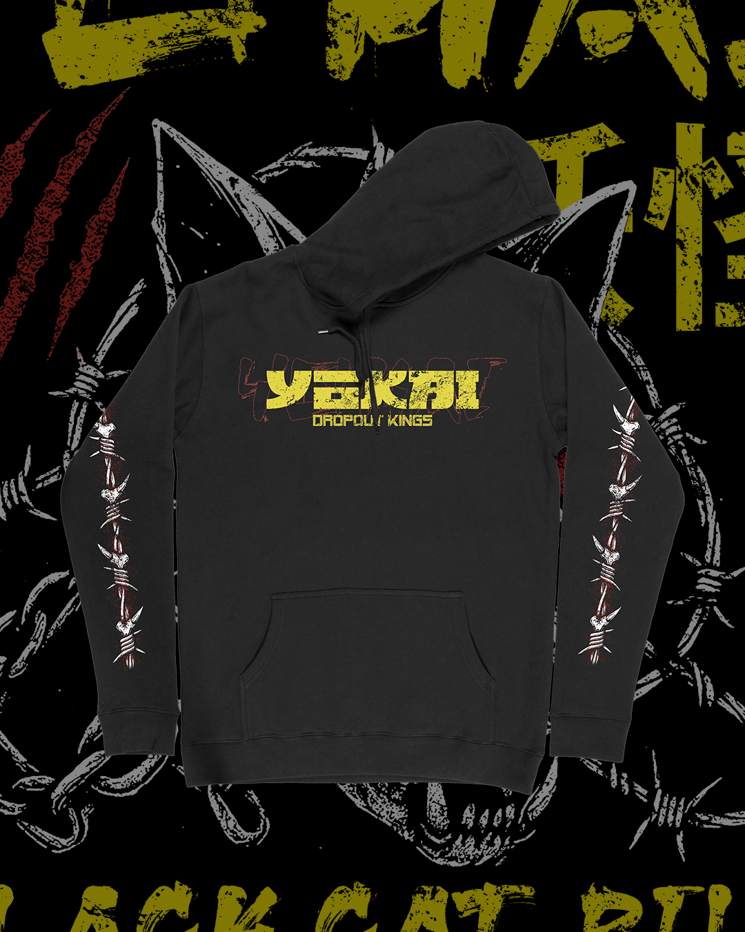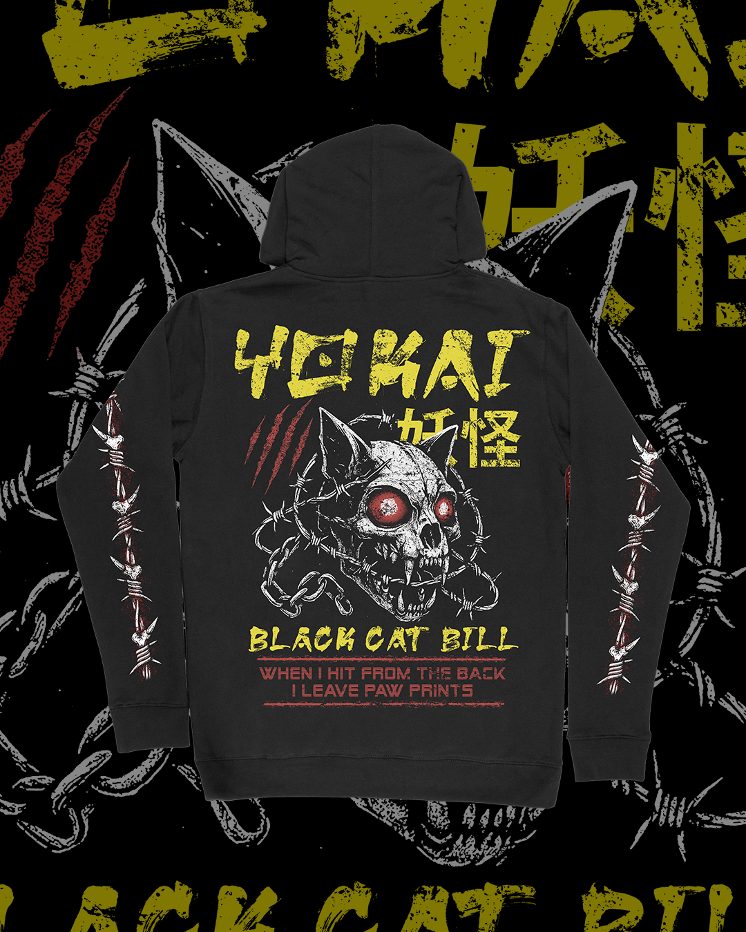 Part of the exclusive Yokai merch line, the Barbed Wire Cat Hoodie is for fans who want to wear the chaos. Killer graphics, Japanese 妖怪 kanji, and sleeve-to-sleeve detailing make this a collector’s piece. Grab yours before this demon disappears.